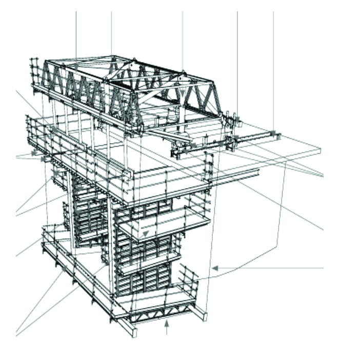 • Modular Design: The system is based on standard MK System, which allows for a high degree of modularity. This enables the carriage and formwork to be adapted to various bridge cross-sections, including those with straight or inclined side walls, and even curved bridge designs.